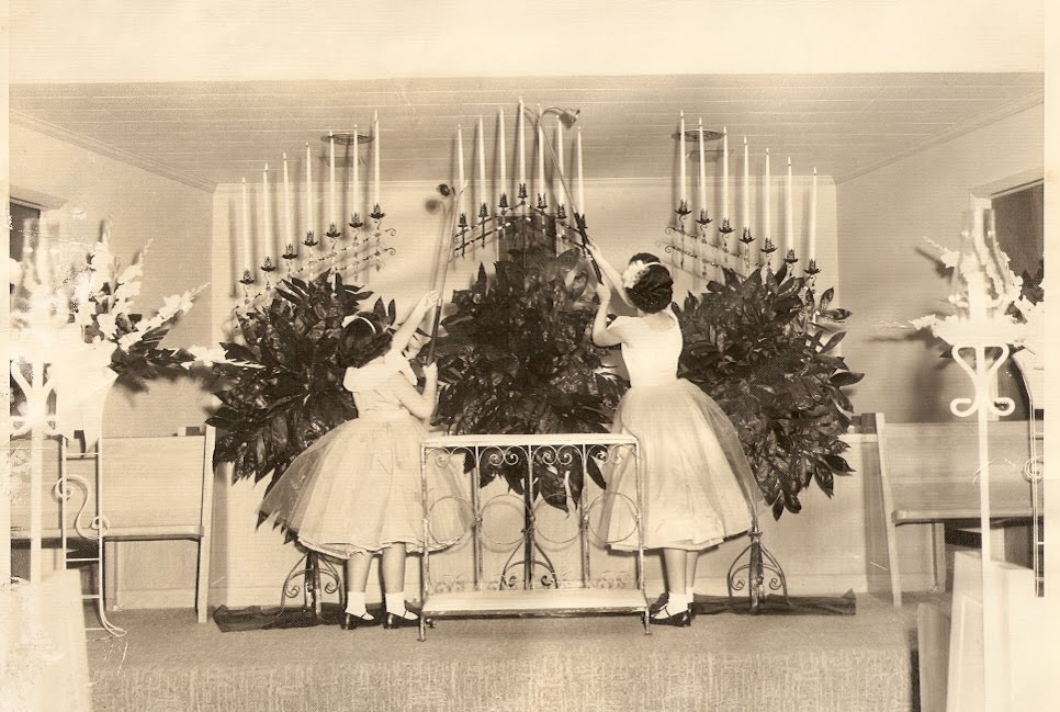 In my memory, there were thousands of candles and, as you can see from the picture above, there were hurricane covers on the candles on the pew markers that had to be removed, candle lit, and then replaced. I was so afraid of dropping and shattering the glass, and out of the corner of my eye I could see that my fellow candlelighter, who was eleven and much taller and faster, was way ahead of me. And I remember playing with her when I would go to church with my grandmother and always thought her name was Karen.